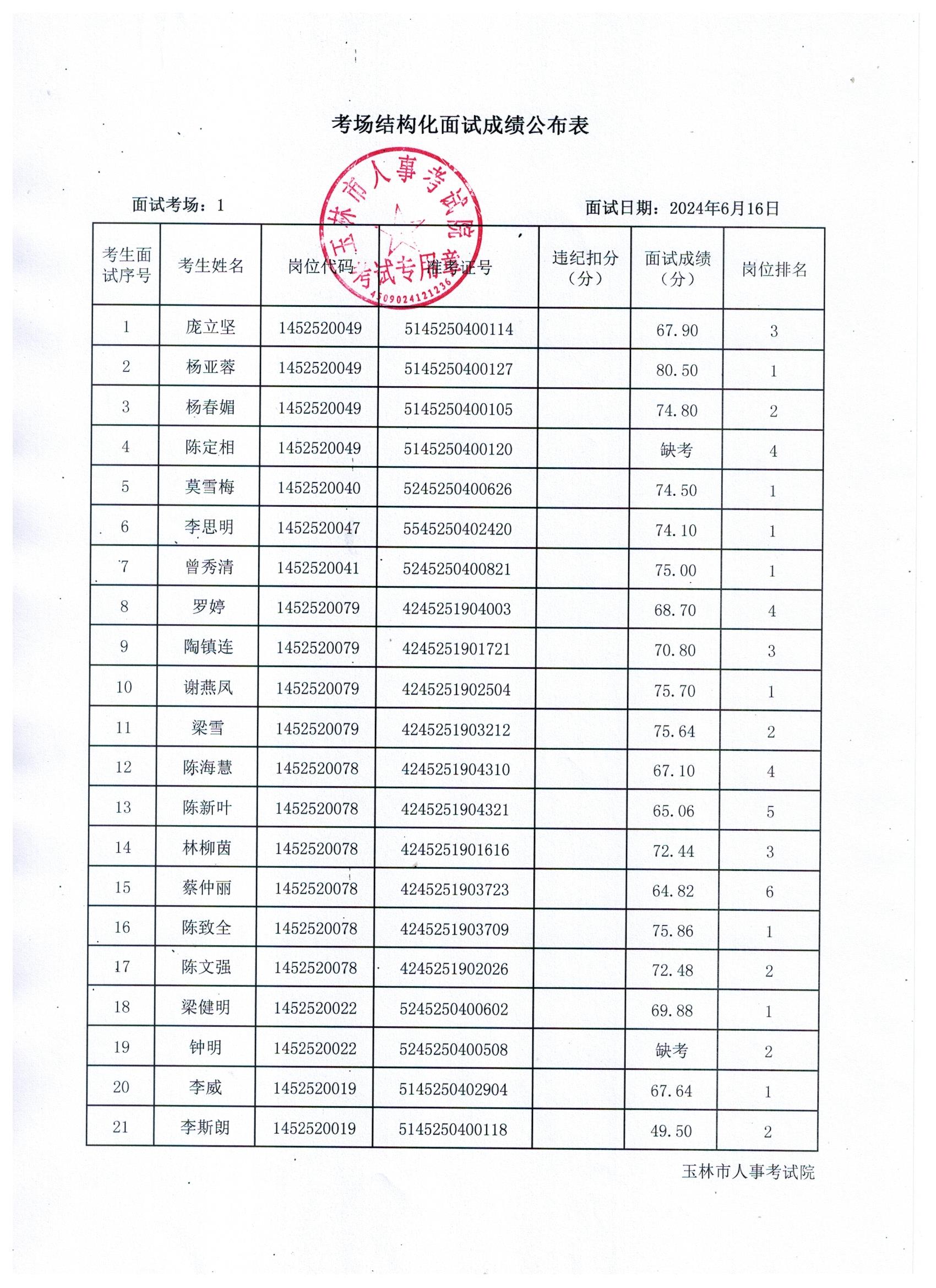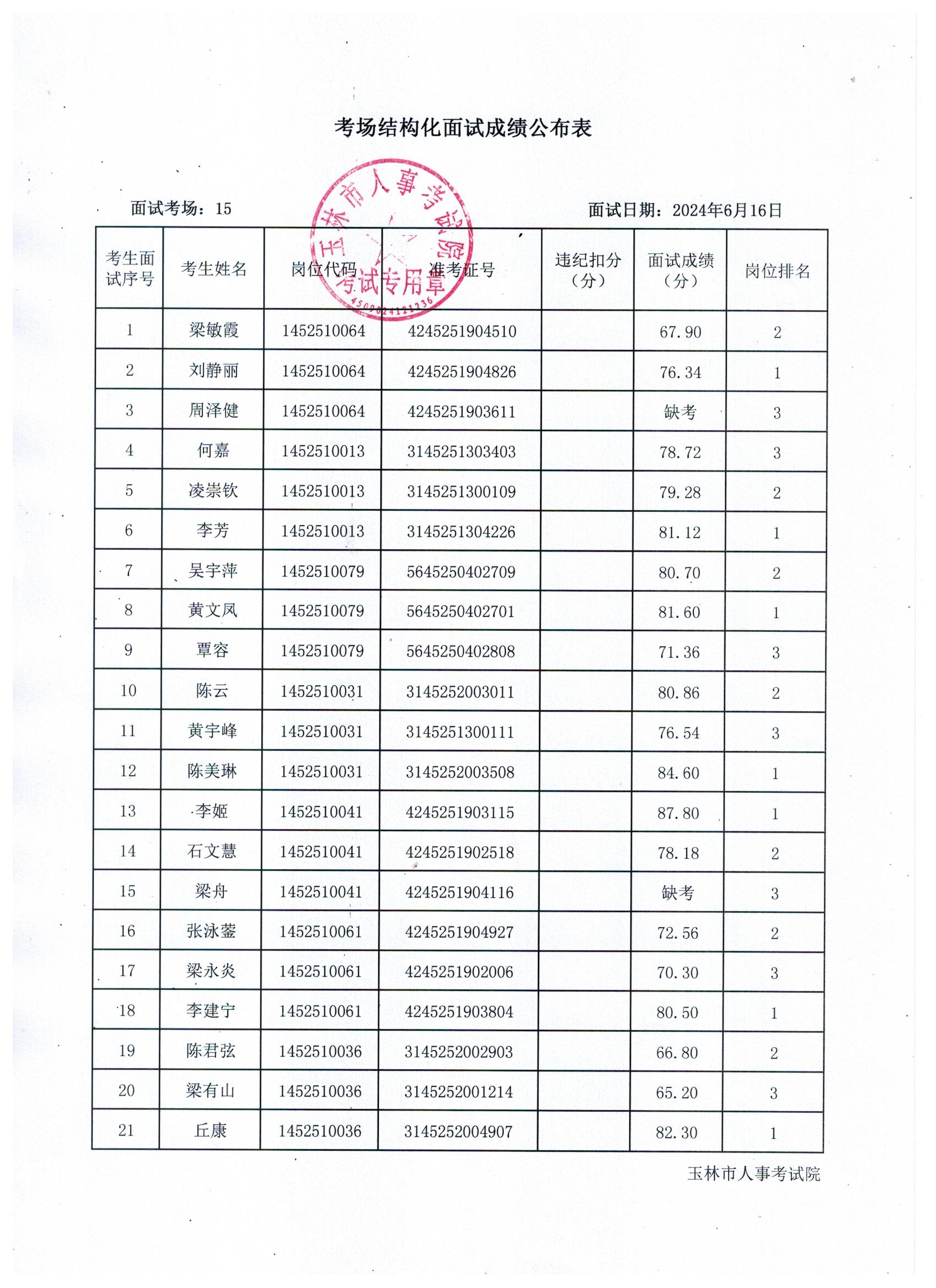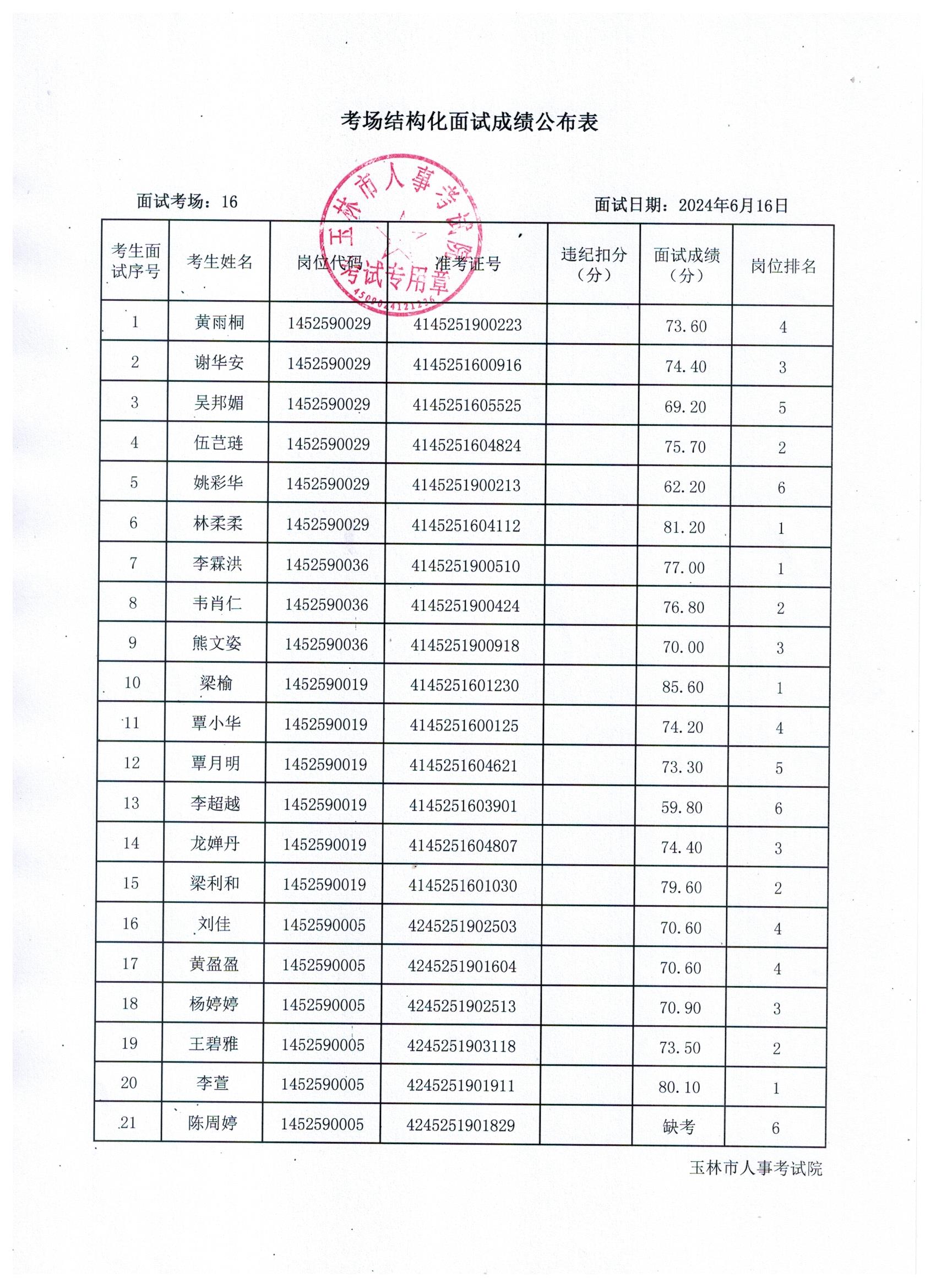 原文標(biāo)題:2024年玉林市直(含玉州區(qū)、福綿區(qū)、玉東新區(qū))事業(yè)單位公開招聘人員面試成績(jī)公布(6月16日)