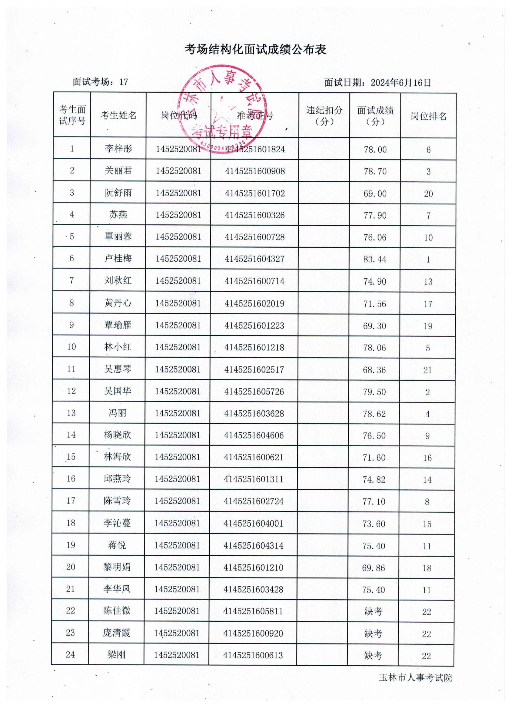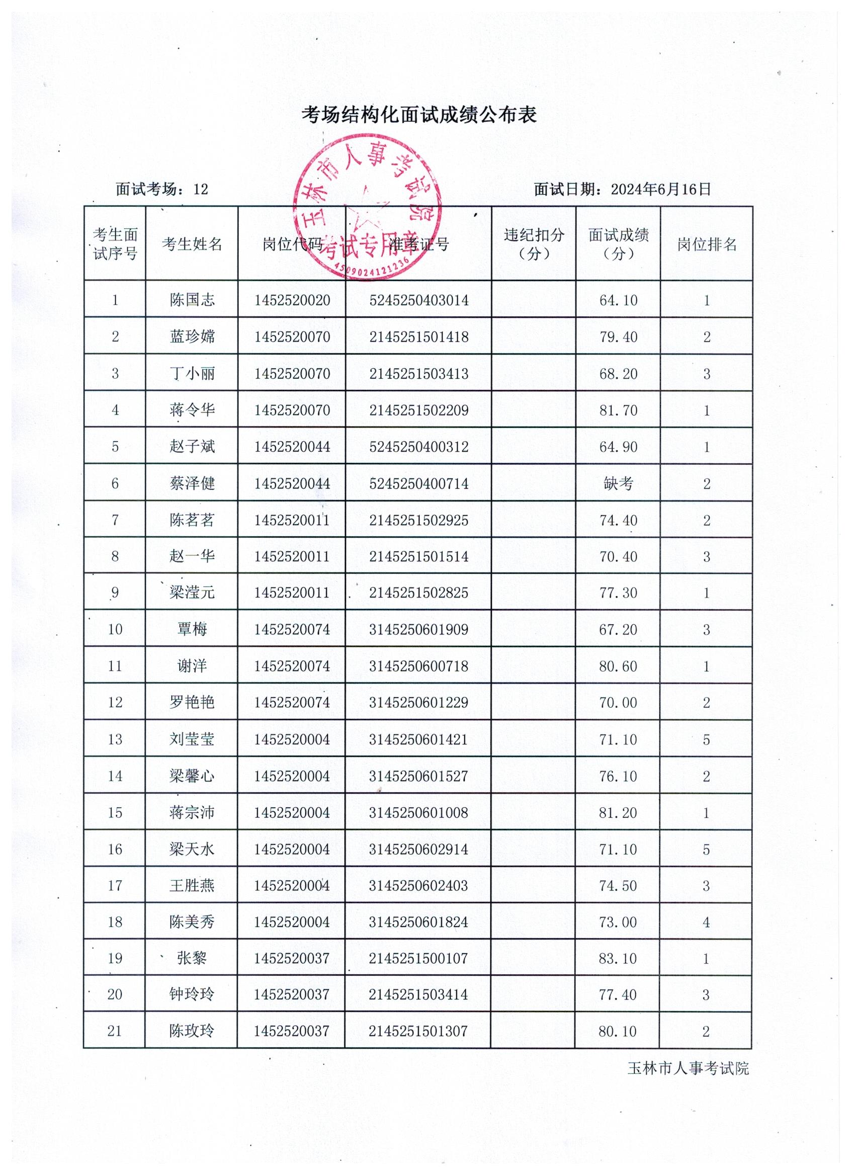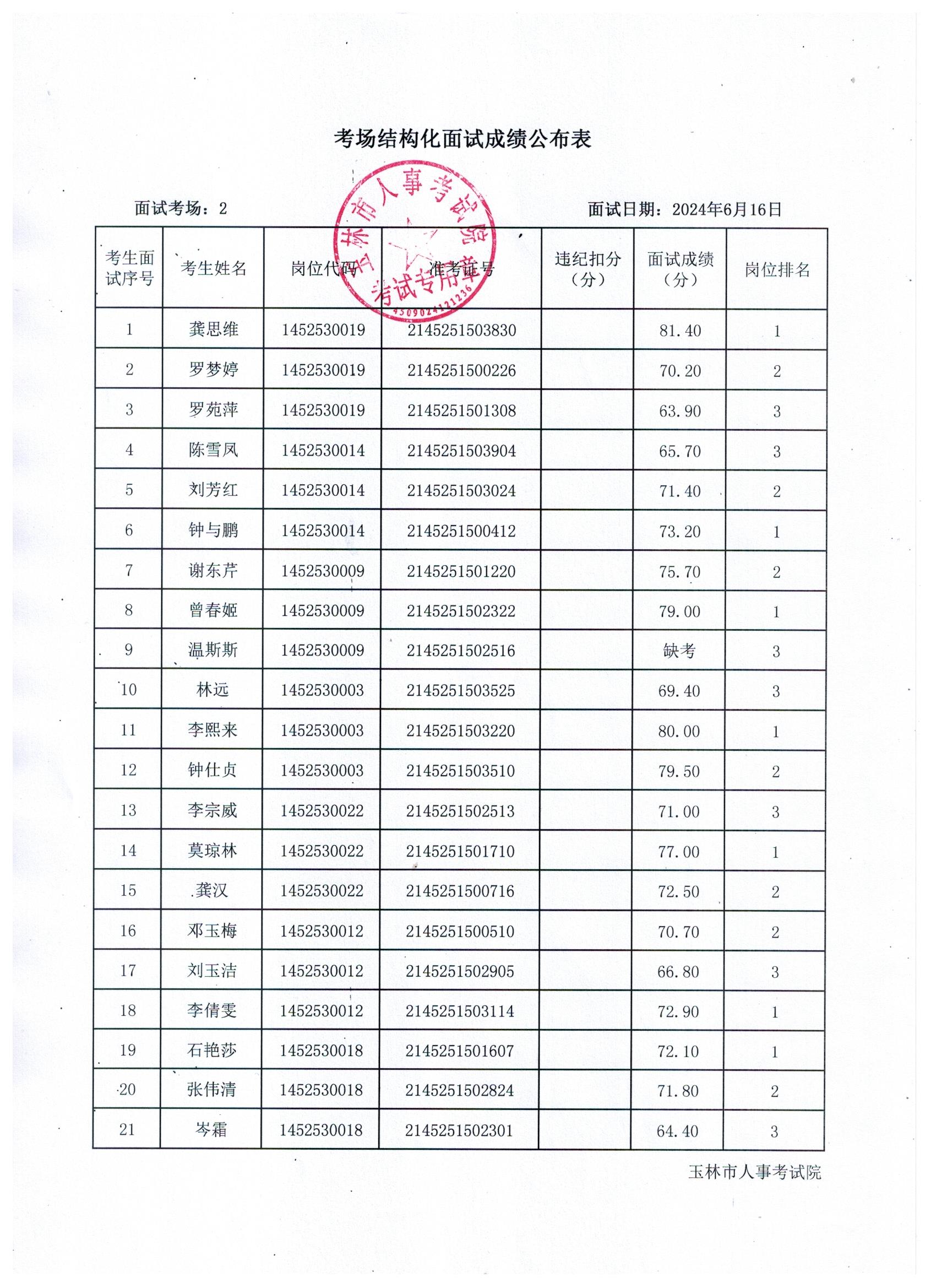 原文標(biāo)題:2024年玉林市直(含玉州區(qū)、福綿區(qū)、玉東新區(qū))事業(yè)單位公開招聘人員面試成績(jī)公布(6月16日)