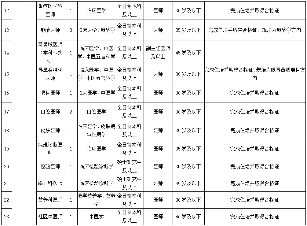 備注:醫(yī)學(xué)類碩士研究生及以上學(xué)歷、醫(yī)學(xué)類副高及以上職稱者不受招聘專業(yè)及名額限制。