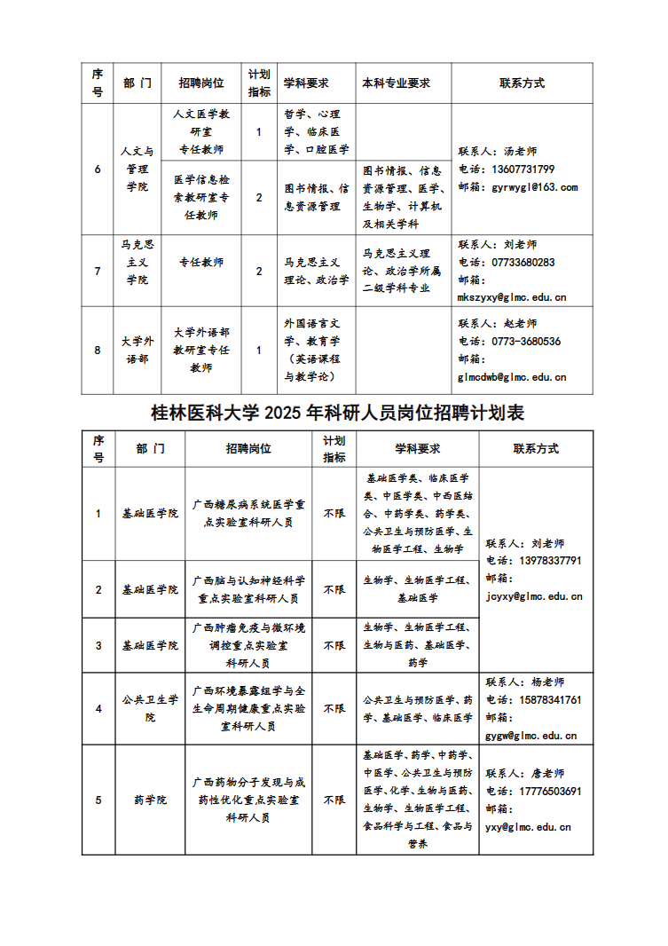 (二)各部門聯(lián)系方式見:桂林醫(yī)科大學各崗位招聘計劃表。