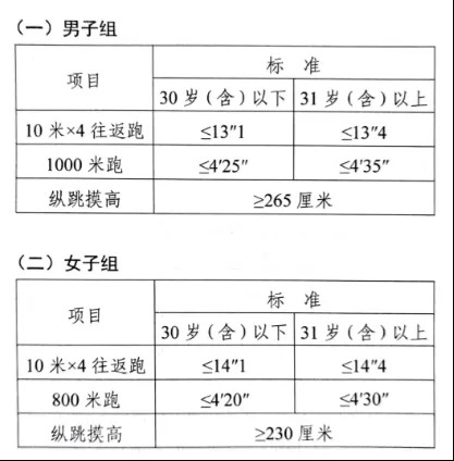 參照《公安機(jī)關(guān)錄用人民警察體能測(cè)評(píng)項(xiàng)目和標(biāo)準(zhǔn)》的項(xiàng)目及測(cè)試規(guī)則開展體能測(cè)評(píng),本次體能測(cè)評(píng)的項(xiàng)目和標(biāo)準(zhǔn)如下: