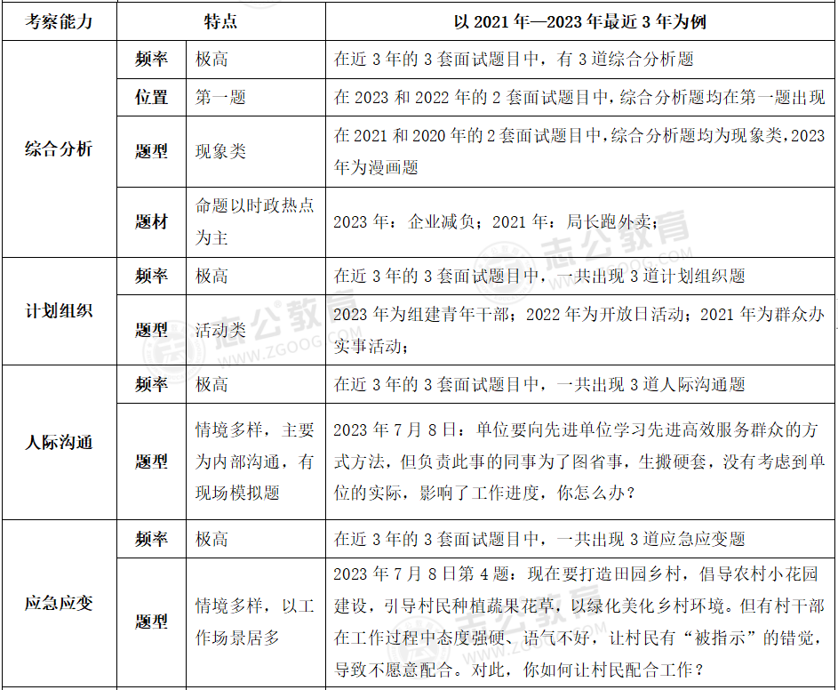 貴港事業(yè)單位面試主要采用結(jié)構(gòu)化面試形式;審題時(shí)間:2分鐘;答題時(shí)間:12分鐘;考查題量:4題為主。考務(wù)情況:考官不讀題、統(tǒng)一計(jì)時(shí)、超時(shí)會(huì)提醒。考查題型:綜合分析(極高)、計(jì)劃組織(極高)、人際溝通(極高)、應(yīng)急應(yīng)變(較高)、貫徹執(zhí)行(較高)、自我認(rèn)知(一般)。