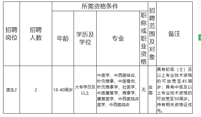 根據(jù)工作需要,決定面向社會公開招聘醫(yī)生(中醫(yī)類)2人,現(xiàn)將有關事項公告如下: