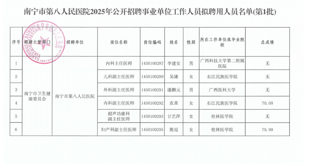 南寧市第八人民醫(yī)院2025年公開(kāi)招聘事業(yè)單位工作人員擬聘用人員公示(第1批)