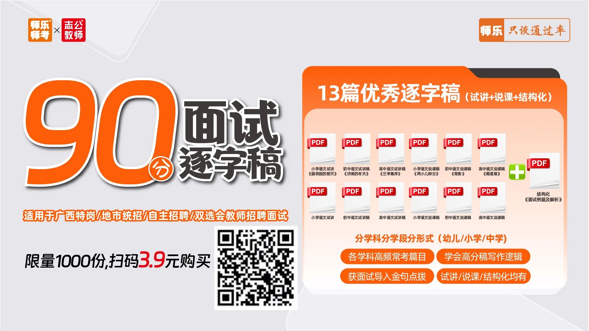 ??寫(xiě)作邏輯+面試導(dǎo)入金句點(diǎn)撥 ?含13+篇試講+說(shuō)課+結(jié)構(gòu)化 搶先體驗(yàn)價(jià):6.9元 ??14地市教招面試zhen題 了解試講/說(shuō)課/結(jié)構(gòu)化形式及內(nèi)容 面試禮儀課 ??面試禮儀干貨介紹 正反面案例直觀對(duì)比 ??著裝、問(wèn)候、儀態(tài)、言談禮儀等事項(xiàng)介紹 【師樂(lè)】廣西教招備考群 ??最新公告 備考資料 ??刷題打卡 考試交流