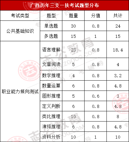 上篇我們寫到,三支一扶的待遇,在廣西這個待遇還算不錯,政策上的支持也非常好,那么預(yù)計(jì)這個月月底出公告的三支一扶,啥時候筆試呢?2024年廣西三支一扶筆試時間是7月13日,其筆試科目為《綜合知識》一科,滿分100分?;谕昕忌幕貞?,綜合知識內(nèi)容主要包括公共基礎(chǔ)知識和行測職業(yè)能力測試兩個科目,而各題型的題量及分值如下圖所示: