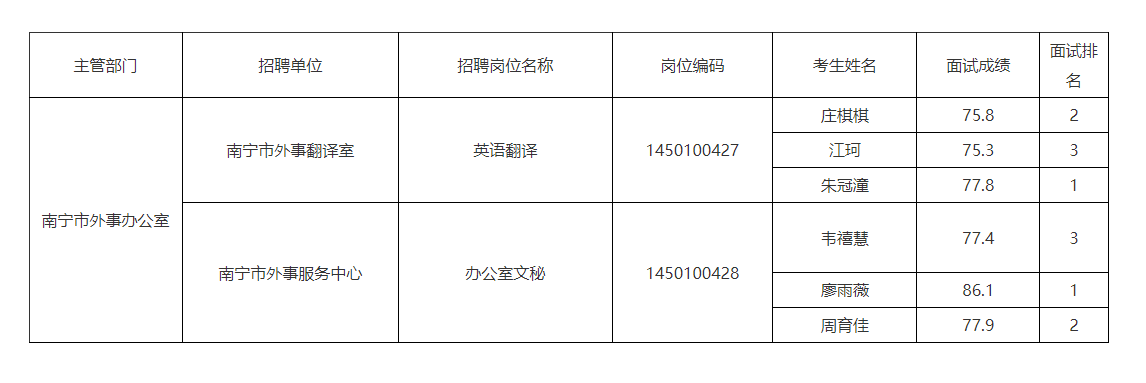 南寧市外事辦公室2025年公開(kāi)考試招聘事業(yè)單位工作人員面試成績(jī)表