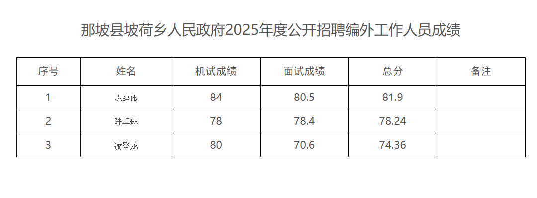 那坡縣坡荷鄉(xiāng)人民政府2025年度公開(kāi)招聘編外工作人員成績(jī)公示