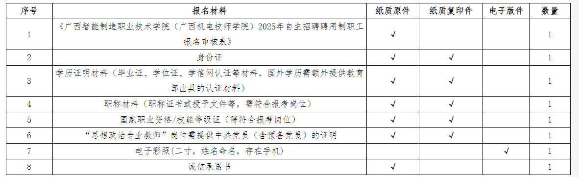應(yīng)聘者按照招聘崗位具體要求對口報名,每名應(yīng)聘者限報一個崗位,采用現(xiàn)場報名遞交應(yīng)聘材料的方式報名。報名人員須下載并填寫《廣西智能制造職業(yè)技術(shù)學(xué)院(廣西機電技師學(xué)院)2025年自主招聘聘用制職工報名審核表》(附表2),同時需附上相應(yīng)的學(xué)歷、學(xué)位證書、身份證、職稱證書(相關(guān)崗位需要)等材料的原件與復(fù)印件(原件審核后退回,復(fù)印件不退回)