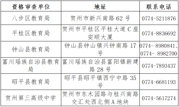 詳見(jiàn)已發(fā)布的《2025年賀州市中小學(xué)(幼兒園)教師公開(kāi)招聘簡(jiǎn)章》附件1《2025年賀州市中小學(xué)(幼兒園)教師公開(kāi)招聘崗位計(jì)劃表》,資格審查單位信息如下表: