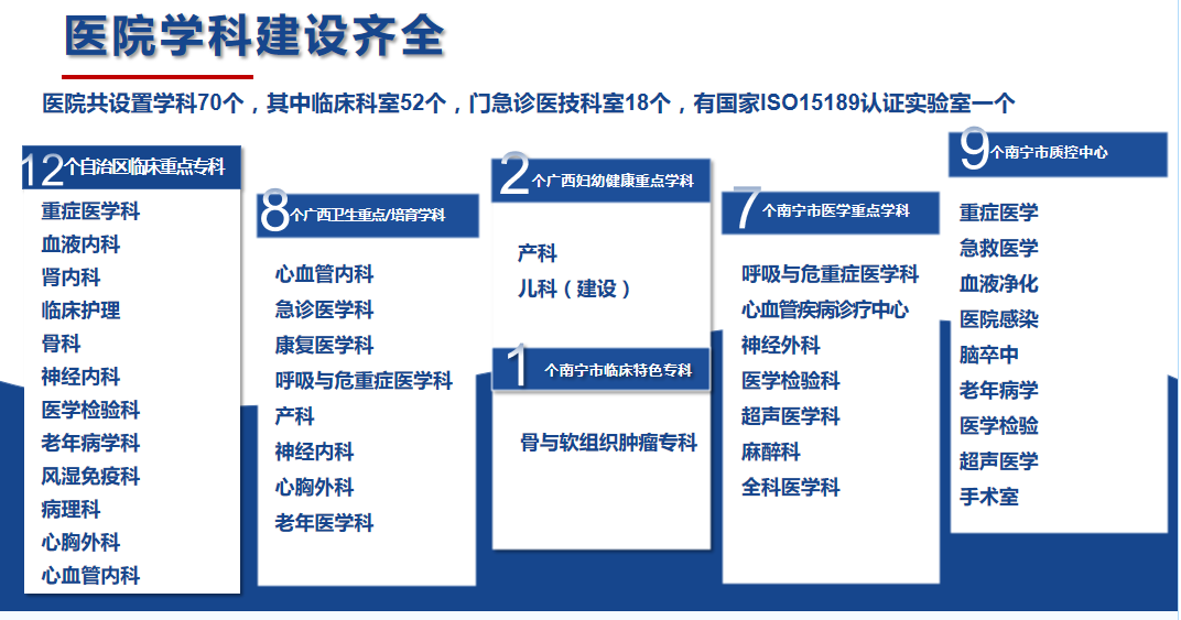 南寧市第一人民醫(yī)院(南寧市兒童先天性心血管疾病研究所、南寧市呼吸道疾病研究所、廣西醫(yī)科大學第五臨床醫(yī)學院、廣西醫(yī)科大學第五附屬醫(yī)院)始建于1914年,是一家擁有百年歷史的國家三級甲等綜合性醫(yī)院。醫(yī)院設(shè)有52個臨床病區(qū),18個門診醫(yī)技科室,總開放床位1912張(含分院)。醫(yī)院是國家高級認知中心建設(shè)單位及國家神經(jīng)介入建設(shè)中心、國家ISO15189醫(yī)學檢驗認證機構(gòu),國家聯(lián)盟中心認證的胸痛中心、卒中中心;擁有廣西臨床重點??疲ê嘤?2個、自治區(qū)醫(yī)療衛(wèi)生重點學科(含培育)8個、自治區(qū)婦幼健康服務(wù)重點學科(含建設(shè))2個、南寧市醫(yī)學重點學科7個、南寧市臨床特色優(yōu)勢???個,南寧市質(zhì)控中心9個。醫(yī)院是國家衛(wèi)健委創(chuàng)面修復能力建設(shè)和繼續(xù)教育中心教學基地、國家級住院醫(yī)師規(guī)范化培訓培訓基地,廣西醫(yī)科大學碩士研究生培養(yǎng)基地,同時是暨南大學共建醫(yī)學教育基地、第十批廣西博士后創(chuàng)新實踐基地;醫(yī)院還具備國家藥物臨床試驗機構(gòu)資質(zhì)(含I期研究室);醫(yī)院醫(yī)學實驗中心獲批廣西科技廳重點實驗室“廣西智慧精準醫(yī)學實驗室”,是南寧市衛(wèi)健系統(tǒng)唯一的省級重點建設(shè)實驗室。2019年在市委市政府支持下,成立南寧市第一人民醫(yī)院醫(yī)療集團。現(xiàn)有27家成員單位,形成“1+4+22”(中心醫(yī)院+4家二級醫(yī)院+22家基層衛(wèi)生及養(yǎng)老機構(gòu))一體化格局,推行“三二一”運營管理模式,逐步構(gòu)建全生命周期健康管理鏈。