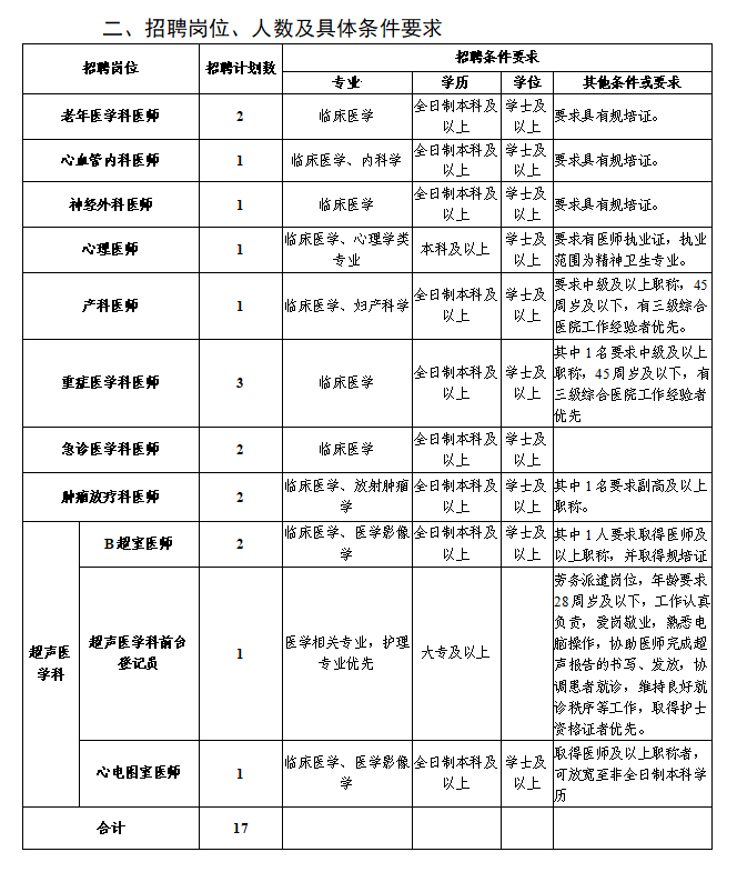 注:初中級職稱應聘人員原則上年齡要求為35周歲及以下;如為副高以上職稱,年齡可放寬至45周歲;學歷層次高者優(yōu)先。醫(yī)師崗位中如要求具有規(guī)培證條件的是指已取得規(guī)培合格證書(含通過規(guī)培結(jié)業(yè)考試未領合格證書)或已取得中級及以上職稱人員。