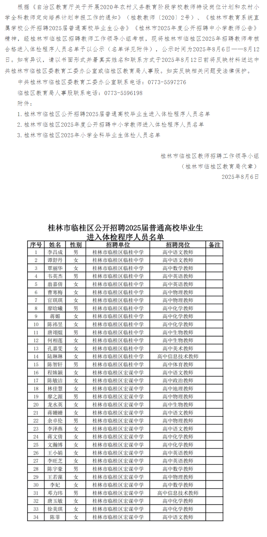 文章來源:桂林市臨桂區(qū)2025年招聘教師考核合格進入體檢程序人員名單公示