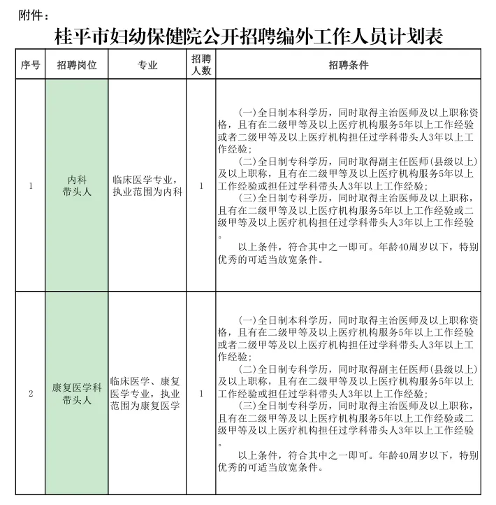 詳見《桂平市婦幼保健院公開招聘編外工作人員計(jì)劃表》(附件)
