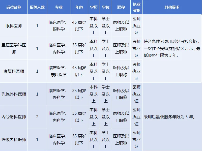 ■ 眼科、康復醫(yī)學科、重癥醫(yī)學科醫(yī)師為我院緊缺崗位人才,符合條件錄用者,經試用考核合格后可享受安家費補貼。