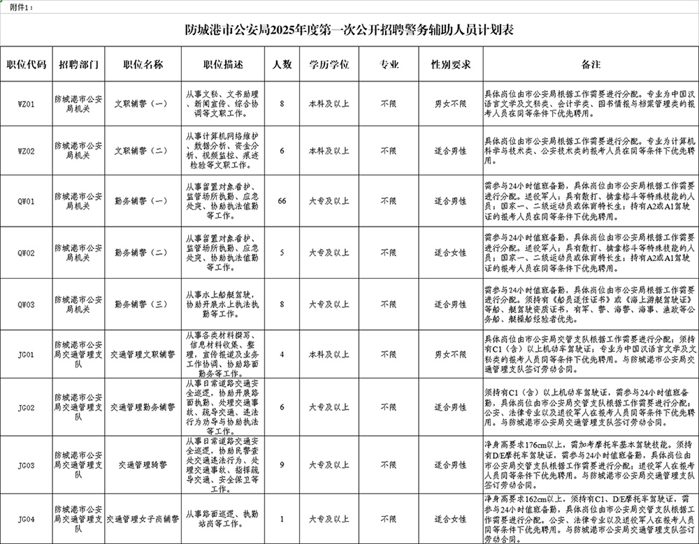 附件:1. 防城港市公安局2025年度第一次公開招聘警務(wù)輔助人員計劃表