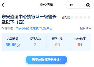其中東興遣返中心執(zhí)行隊(duì)一級(jí)警長及以下(四)崗位歷年入面分為56.65分、報(bào)考人數(shù)為59人↓