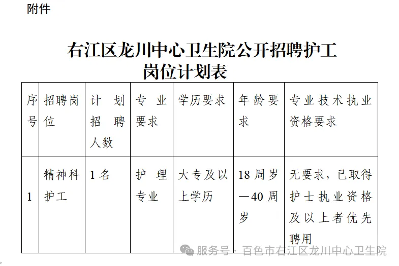 附件:右江區(qū)龍川中心衛(wèi)生院公開招聘護(hù)工崗位計(jì)劃表