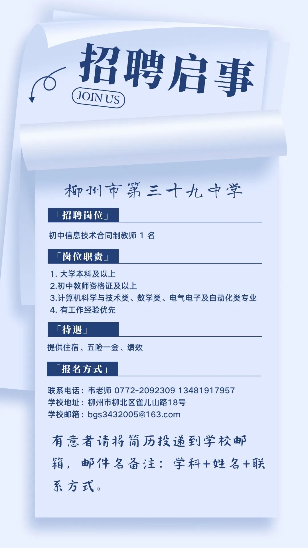 2025年柳州市第三十九中學招聘初中信息技術(shù)合同制教師1名