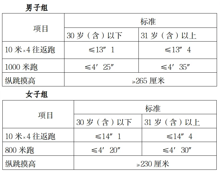 測評結(jié)果分為合格和不合格。一般體能測評三項(xiàng)成績均達(dá)標(biāo)的方為合格,其中具有研究生及以上學(xué)歷報(bào)考人員,體能測評三個項(xiàng)目中有任何兩項(xiàng)達(dá)標(biāo)的,即視為合格。體能測試時(shí)間、地點(diǎn):另行通知。