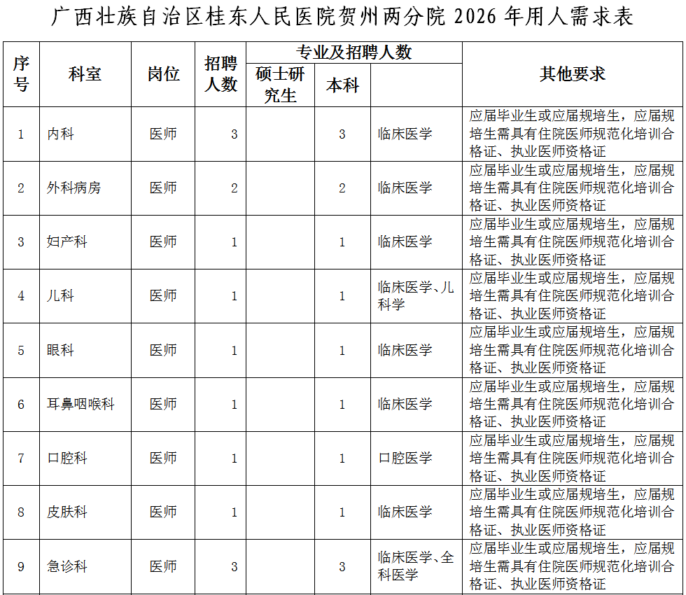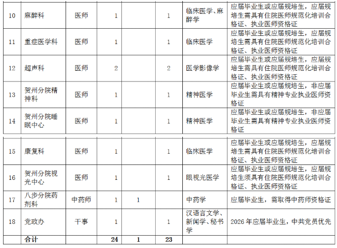 (應(yīng)聘報(bào)名二維碼)同時(shí),按以下要求提供個(gè)人應(yīng)聘材料(電子版)發(fā)電子郵箱:gdyy2817726@163.com(郵件主題請(qǐng)標(biāo)明:“姓名+賀州兩分院”字樣)。應(yīng)屆畢業(yè)生:個(gè)人簡(jiǎn)歷、身份證、就業(yè)推薦表、成績(jī)單、各種獎(jiǎng)項(xiàng)獎(jiǎng)勵(lì)證書(shū)、外語(yǔ)等級(jí)證書(shū)等。非應(yīng)屆畢業(yè)生:個(gè)人簡(jiǎn)歷、身份證、畢業(yè)證、畢業(yè)證備案登記表、學(xué)位證、學(xué)位證備案登記表、職稱證、執(zhí)業(yè)證、住院醫(yī)師規(guī)范化培訓(xùn)合格證、工作證明等。報(bào)名時(shí)所提交的申請(qǐng)材料必須真實(shí)、準(zhǔn)確,因報(bào)名時(shí)提交的申請(qǐng)材料不真實(shí)、不完整或錯(cuò)誤填寫(xiě)報(bào)名信息,造成資格審查、面試資格審查不通過(guò)的,后果由報(bào)名人員自行承擔(dān)。(2)資格審核。人事科依據(jù)招聘公告和用人需求規(guī)定的資格條件對(duì)應(yīng)聘人員簡(jiǎn)歷進(jìn)行收集和資格初步審查,經(jīng)招聘工作領(lǐng)導(dǎo)小組審核后,確定符合崗位條件報(bào)名人員名單,由醫(yī)院人事科電話或短信通知符合條件人員。(3)考核??己斯P試和面試由人事科負(fù)責(zé)組織實(shí)施,協(xié)助部門為醫(yī)務(wù)部、護(hù)理部、科教科以及用人科室,紀(jì)律監(jiān)督部門為監(jiān)察室。逾期未參加則視為自愿放棄。(4)試工。通過(guò)考核的非應(yīng)屆畢業(yè)應(yīng)聘人員,須到醫(yī)院試工5天。試工不通過(guò),不予聘用。(5)體檢。體檢工作由廣西壯族自治區(qū)桂東人民醫(yī)院按照有關(guān)規(guī)定統(tǒng)一組織。體檢標(biāo)準(zhǔn)參照《廣西壯族自治區(qū)事業(yè)單位公開(kāi)招聘人員體檢通用標(biāo)準(zhǔn)(試行)》《廣西壯族自治區(qū)事業(yè)單位公開(kāi)招聘人員體檢操作手冊(cè)(試行)》執(zhí)行。體檢不合格或隱瞞真實(shí)情況致使體檢結(jié)果失真的,不予聘用。因體檢不合格空缺崗位的,將按考核的綜合成績(jī),從高到低,順位補(bǔ)充體檢人員。(6)公示和聘用。對(duì)擬聘非應(yīng)屆畢業(yè)應(yīng)聘者在全院范圍內(nèi)進(jìn)行公示,公示期為5個(gè)工作日,公示期滿無(wú)異議按程序辦理聘用手續(xù)。對(duì)公示有異議,經(jīng)核實(shí)影響聘用的,取消其聘用資格;對(duì)反映問(wèn)題難以核實(shí)的暫緩聘用,待核實(shí)清楚后按有關(guān)規(guī)定辦理。