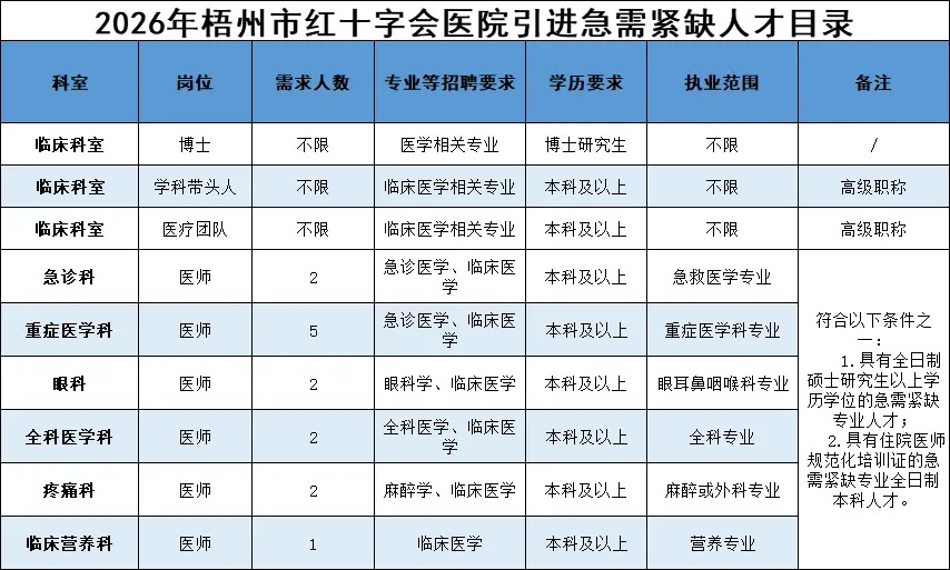 符合條件者享受梧州市高層次(緊缺)人才引進政策和梧州市紅十字會醫(yī)院急需緊缺人才引進政策,提供事業(yè)單位編制及安家費: