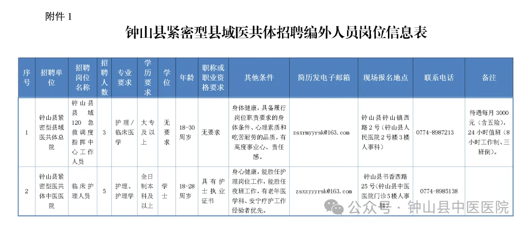 5.崗位具體信息及要求詳見(jiàn)附件1《鐘山縣緊密型縣域醫(yī)共體招聘編外人員崗位信息表》(如下圖)。