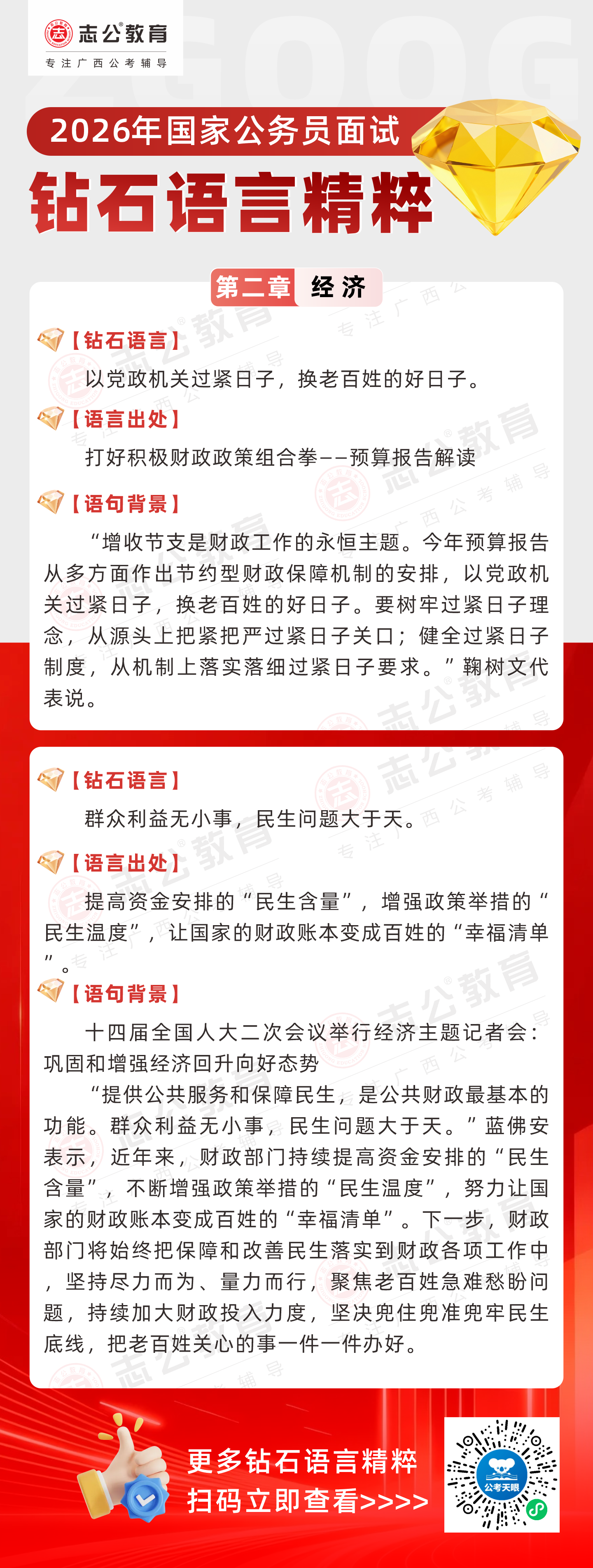 志公教育推出《2026國(guó)家公務(wù)員面試·鉆石語(yǔ)言精粹》經(jīng)濟(jì)篇!幫助考生把握經(jīng)濟(jì)類題目應(yīng)答邏輯,提升語(yǔ)言表達(dá)層次,助你在面試中脫穎而出。備考2026國(guó)考面試,從掌握“鉆石語(yǔ)言”開(kāi)始!