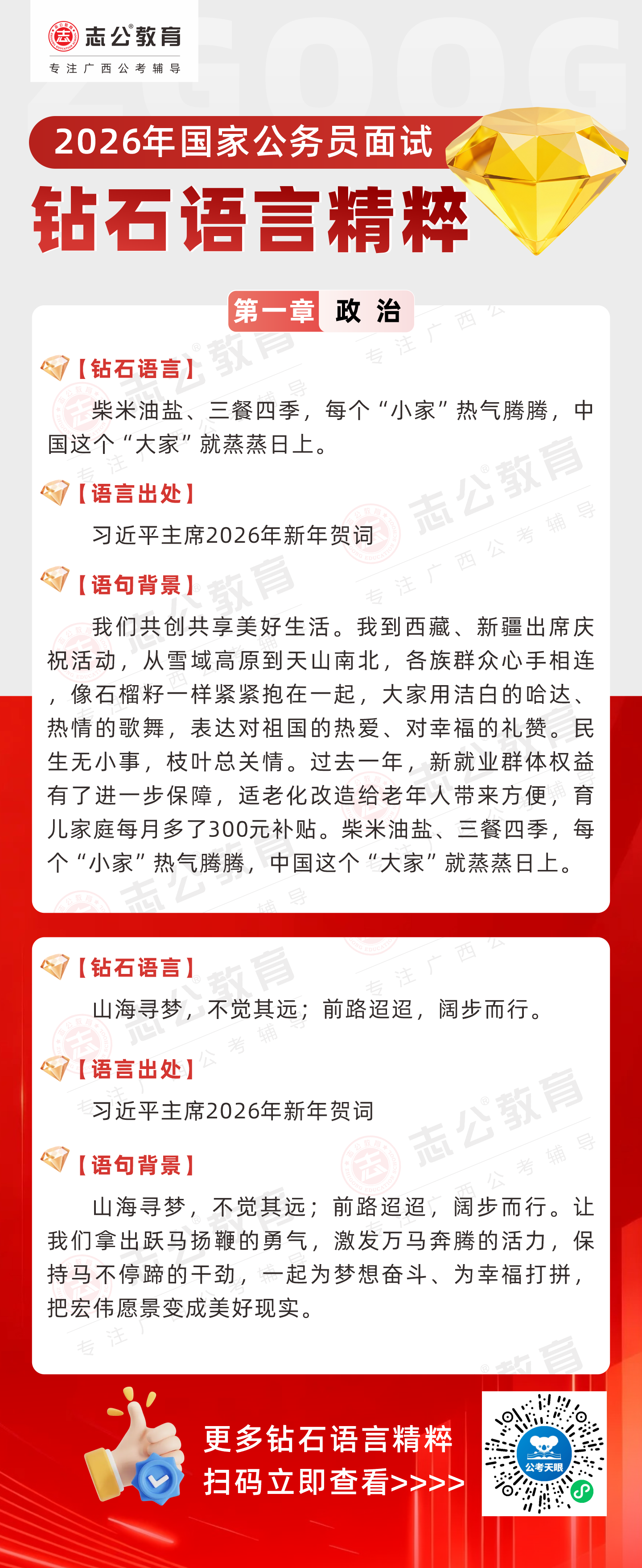 志公教育推出《2026國家公務(wù)員面試·鉆石語言精粹》政治篇!幫助考生把握政治類題目應(yīng)答邏輯,提升語言表達(dá)層次,助你在面試中脫穎而出。備考2026國考面試,從掌握“鉆石語言”開始!