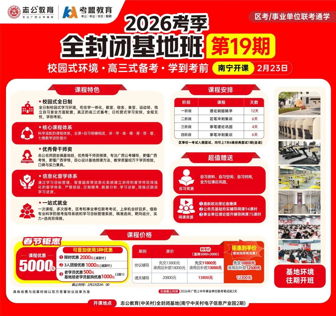 ?校園式環(huán)境,隔絕外界干擾:志公教育(中關(guān)村)2026考季全封閉基地班19期打造全日制校園式學(xué)習(xí)環(huán)境,高三嚴管式備考,一直可以學(xué)到考前。如果你自律性較差,需要一個好的學(xué)習(xí)氛圍和環(huán)境;如果你想要更快速上/岸,那你需要一個科學(xué)的學(xué)習(xí)體系,如果你想要考更好的職位,那你需要個性化和有效的提分方案,那么恭喜你,已經(jīng)找到了解決方法,請來志公教育全封閉基地班!