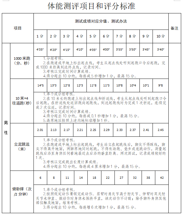 任一單項(xiàng)得分為0的視為“不合格”,予以淘汰。體能測(cè)試所有項(xiàng)目均只測(cè)試一次,(標(biāo)準(zhǔn)見附件2、附件3)。